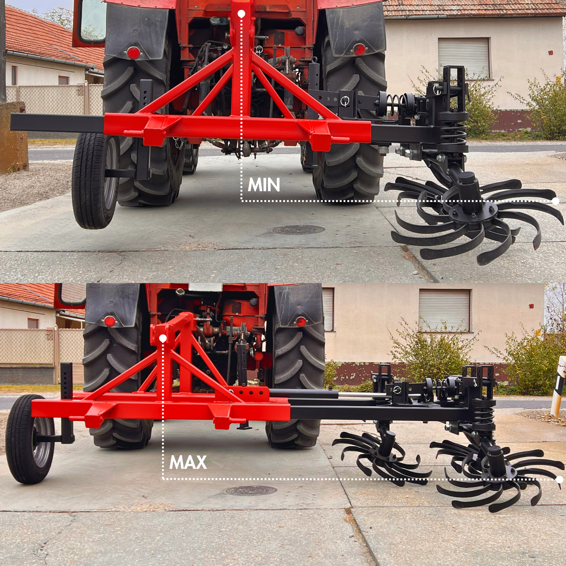 (**) Extra manual width adjustment allows to extend the rotary hoe with an additional 250mm (7 positions manually adjustable) to the right side.